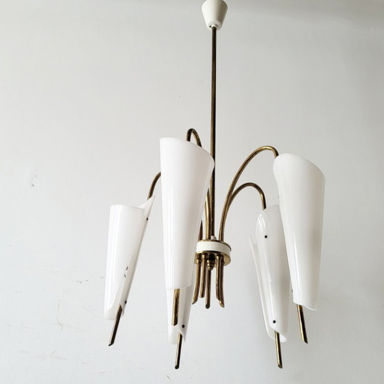 Good overall condition, slight oxidation of the gilded brass, white marks on the central tube. Some metal has melted inside two of the lampshades, but fortunately this is completely invisible; the exterior is in excellent condition. Works. For E14 small screw-in bulbs (new generation). Height 82 cm. Length 43 cm. Width 42 cm. A magnificent chandelier. International bidders welcome! Please feel free to contact us with any questions you may have. Thank you.