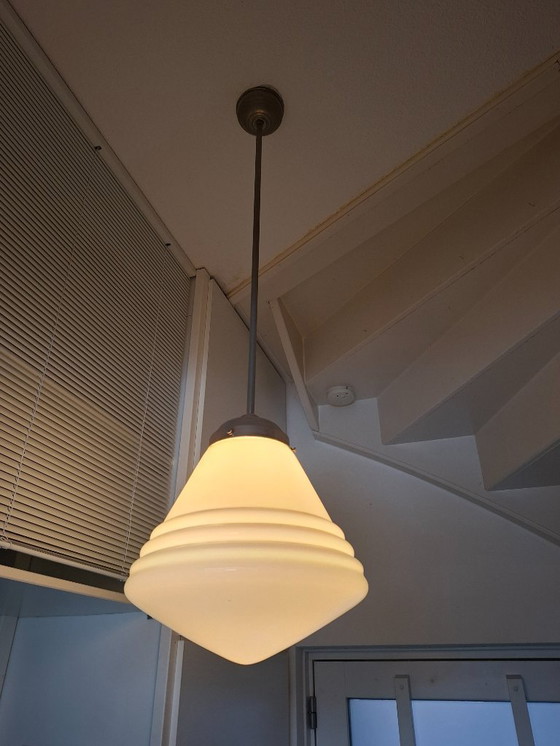 Beautiful vintage pendant lamp with a glass shade. Brand: GISO. Style: Gispen school lamp.