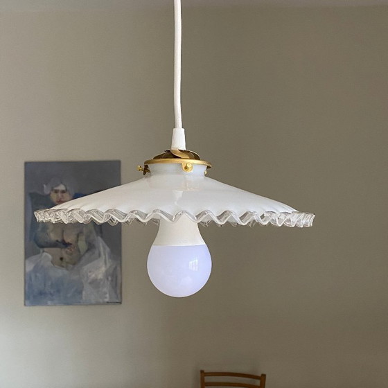 Vintage pendant light with a white opaline glass shade and a clear, wavy rim. The entire piece has been restored in my workshop, as have all the light fixtures I offer for sale.
