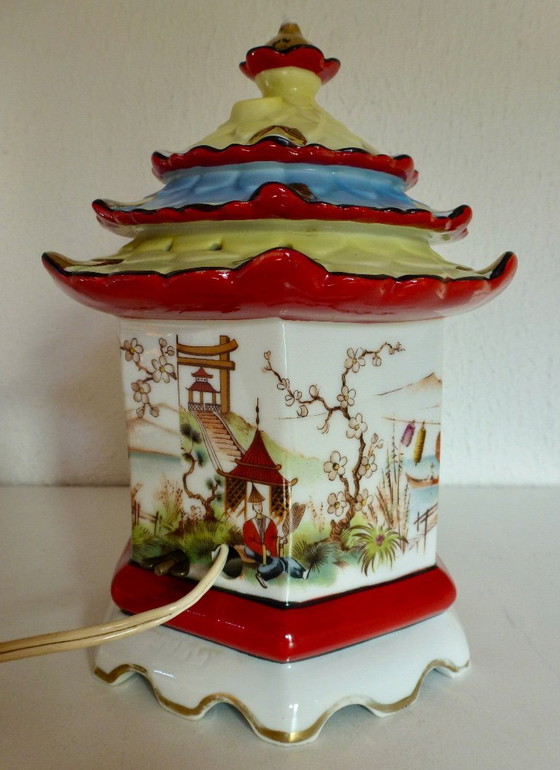 Unique vintage perfume lamp in the shape of a Chinese pagoda, made of porcelain.
