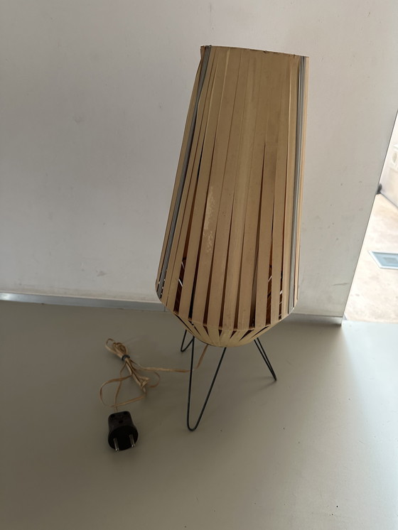 Not so many of these lamps have survived unfortunately. The plastic weave is discolored and a little stained here and there. The lacquer of the legs is a little damaged at the bottom.