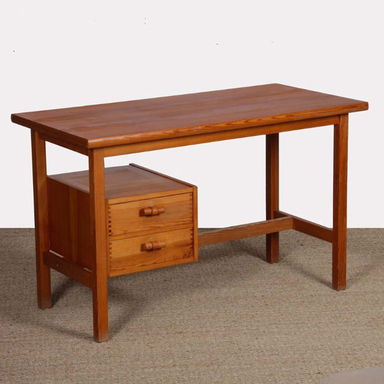 This vintage pine desk dates from the 1980s. It opens thanks to two drawers with leather handles. This table is in good original condition. The top has been restored.