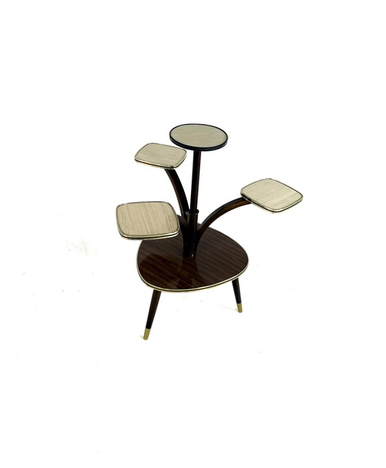 Beautiful piece. This plant table dates from the 1960s. Tapered legs. The plant table has five shelves at different heights. Finished in cream and brown Formica. The table features elegant brass details, giving it a chic look.