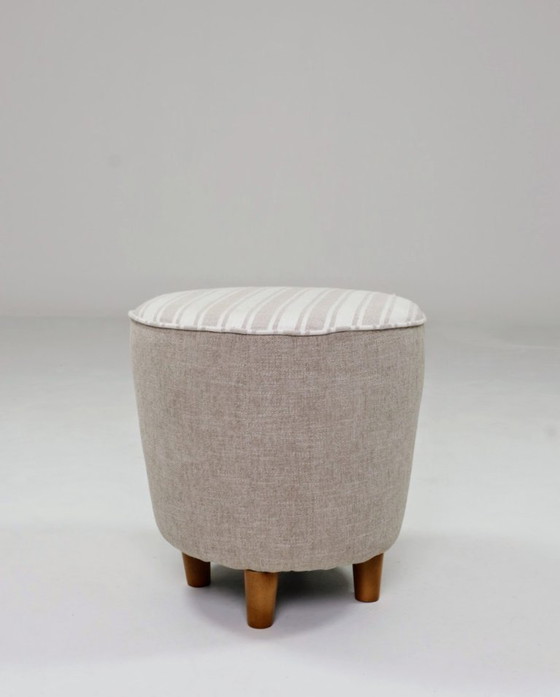 Vintage pouf new upholstery fabric natural Lin beige white stripes, wooden legs . Perfect condition. 2 available Price by one 179E