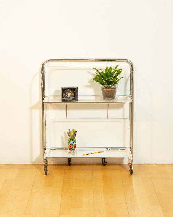 A functional and elegant vintage trolley by Raquer. The chrome frame paired with white shelves creates a classic Mid-Century look. Its folding design makes it easy to store while staying versatile as a serving trolley, side table, or bar cart. A practical and stylish piece ready to bring character to your space.