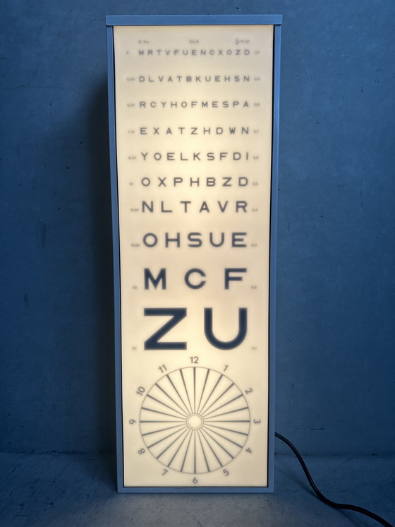 Unique wall lamp (can also be placed on a cabinet or table) from an ophthalmologist's office. Probably from the 70s/80s. A real eye-catcher. Fits in an industrial interior. Original lamps. Perfect for use as mood lighting. Also equipped with a switch. Very nice mood lighting and very decorative. Dimensions: 78cm x 27cm. Depth: 12cm. Comes with a long cord and plug. No cracks or dents. Weight: 5.2kg. Labeled: Ella.