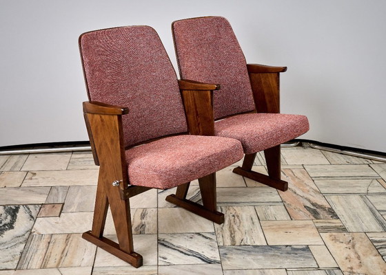 Vintage double-seat cinema chair, manufactured in 1970s, Czechoslovakia and assembled for a Prague movie theater. Seats fold when unoccupied.