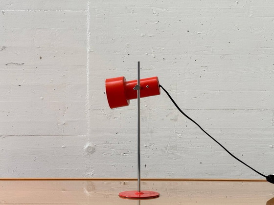 A distinctive table lamp in a functional mid-century design with a clean, technical aesthetic. The cylindrical lamp head, made of lacquered metal in a vibrant red, is rotatable and tiltable, allowing for precise light direction – ideal for task or accent lighting. The slender metal stem, combined with the round, flat base, underscores the lamp's industrial character. The deliberately minimalist design is reminiscent of classic studio and workshop lamps from the 1970s, combining functionality with a strong visual presence. A nice detail is the original toggle switch on the cable, as well as the internal reflector shape, which creates a warm, direct light. The lamp works well both as a standalone statement piece and in combination with other pieces in a modern or vintage interior.