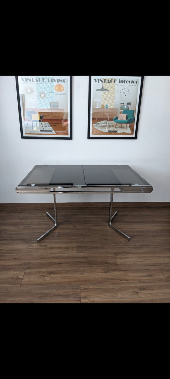 Discover this vintage table from Roche Bobois, a centerpiece that will bring a touch of timeless elegance to your home. With its black glass top and silver metal frame, it embodies sophisticated design and quality craftsmanship.