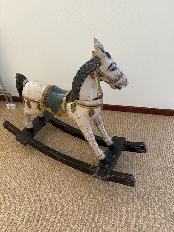 This vintage rocking horse is a beautiful decorative piece, made of sturdy wood and with a timeless design. It features a white body with striking black mane and tail, complemented by green and gold accents. Perfect for adding a nostalgic and charming touch to any room, this piece embodies the essence of vintage style and craftsmanship.