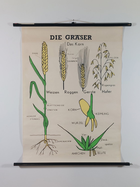 This vintage roll-up map is a fascinating teaching tool for biology, vividly illustrating the world of grasses. The wall map features detailed illustrations of wheat, rye, barley, and oats in clear, vibrant colors, making it a real eye-catcher in any room.