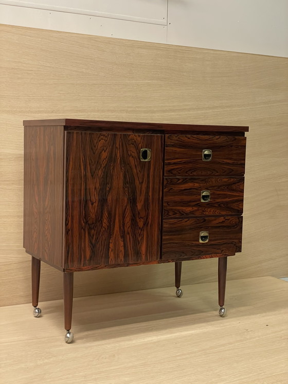 Characterful vintage chest of drawers crafted from beautifully figured rosewood veneer. Sleek Dutch design from the 1960s with slender, tapered legs on casters and refined brass handles. A timeless piece that fits beautifully in a mid-century or modern interior.