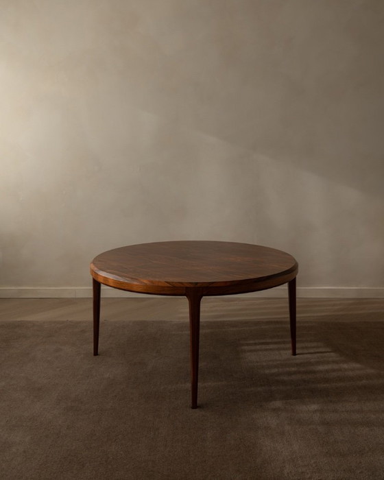 A beautifully restrained round rosewood coffee table (Ø100 cm) designed by Johannes Andersen and produced by CFC, Silkeborg (Denmark), a piece that sits right at the intersection of Danish Modern warmth and architectural minimalism.
