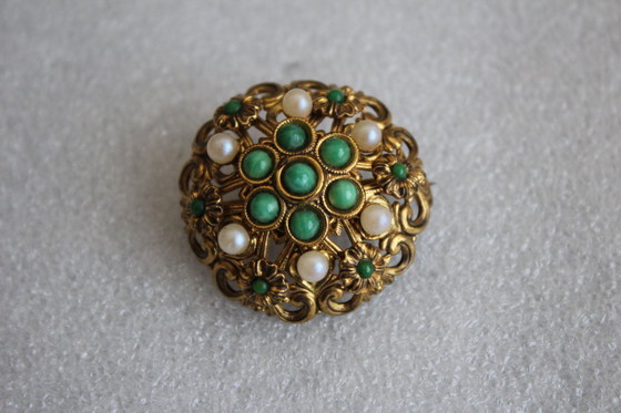 This elegant vintage brooch in a gold finish is a timeless piece of jewelry adorned with white and green pearls. Its delicate round design, measuring 3.5 cm in diameter, makes it a perfect accessory for special occasions or a stylish detail for everyday wear. The combination of gold-colored metal and pearls lends the brooch a classic charm. A must-have for vintage jewelry lovers.