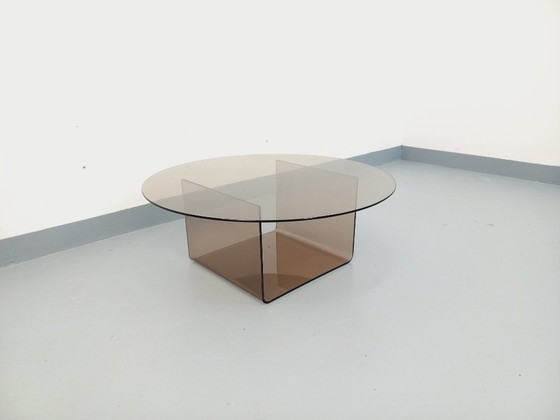Vintage 1970s Space Age style coffee table, round smoked glass top, original and stylish smoked plexiglass base, very good overall condition with some surface scratches.