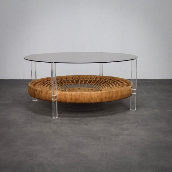 A beautiful and playful coffee table from the 1970s, featuring a striking mix of materials. The smoked glass top rests on clear plexiglass legs, with a handwoven rattan basket underneath.