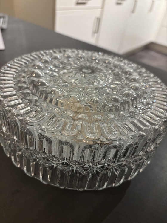 Vintage glass ceiling light, probably from the 1960s or 1970s. These lamps are known for their thick, textured glass with relief patterns that diffuse the light in an atmospheric way.