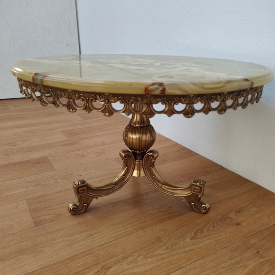 Enrich your living space with this antique onyx coffee table and enjoy the timeless elegance of Hollywood Regency style. The round top is crafted from authentic onyx natural stone and displays a stunning palette of natural color nuances and veining. A richly decorated, openwork brass edge encloses the stone and enhances the premium look of this piece. The tripod base features detailed ornamentation and a beautiful vintage patina that attests to historic craftsmanship. The combination of cool natural stone and warm brass makes this coffee table a timeless statement in a classic and eclectic interior. This robust piece offers enduring quality and undeniable authority for everyday use. Choose an exclusive collector's item that instantly adds character and historical allure to your home.