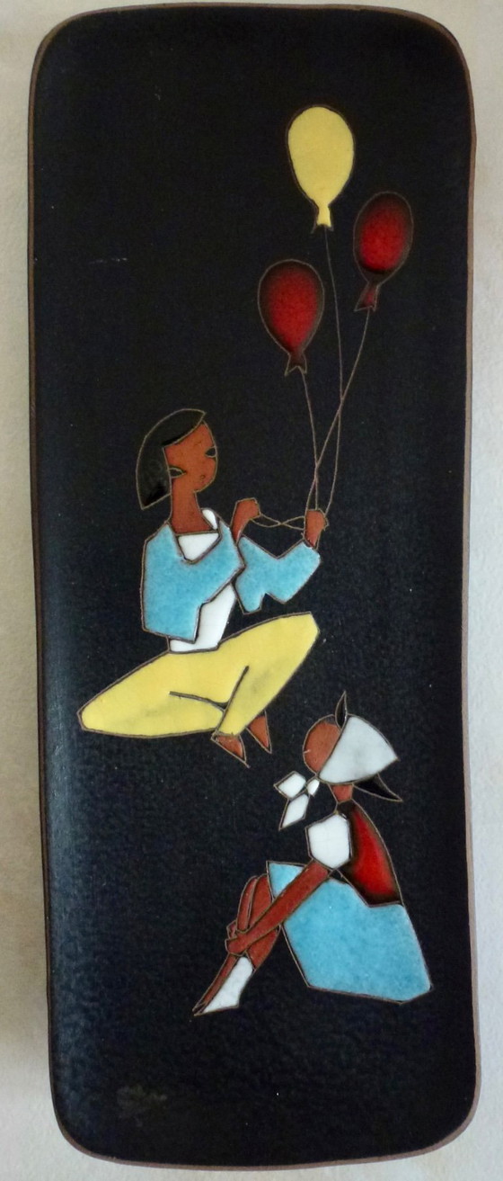 Vintage RUSCHA ceramic wall decoration with hot air balloon seller and child.