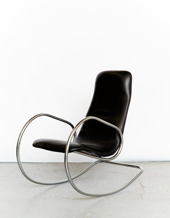 Delicate rocking chair by the German architect and designer Ulrich Böhme from 1971. Upholstered with black genuine leather. Very good condition.