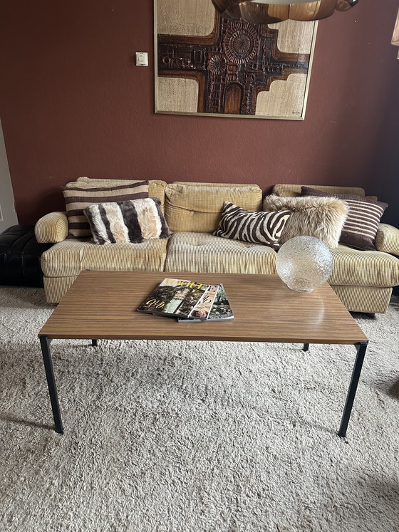 Transport your living room back to a stylish era with this vintage coffee table by Marko Holland. Its sleek wooden top, paired with sturdy black metal legs, offers a perfect blend of elegance and durability. This piece is not just a table; it's a statement of timeless design.