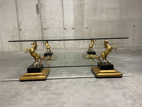 This exquisite vintage coffee table is a true statement piece, featuring a harmonious blend of elegance and artistry. The table is supported by four majestic bronze horses, each poised on sturdy stone pillars, creating a sense of dynamic movement and strength. The transparent glass top offers a clear view of the intricate details below, making it a perfect centerpiece for any sophisticated living space.
