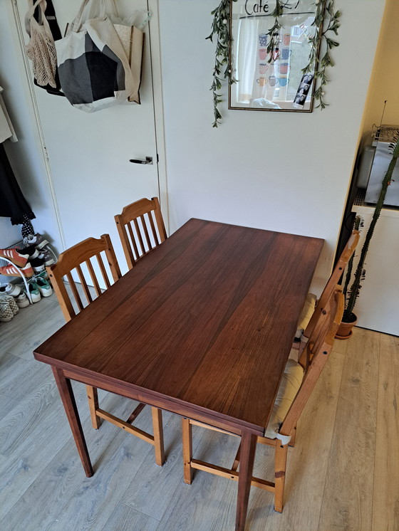 Experience the timeless elegance of Scandinavian design with this vintage extendable dining table crafted from exquisite rosewood. Its rich brown hue and sleek lines make it a perfect centerpiece for any dining room, offering both style and functionality.