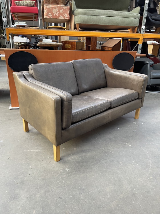 Two-seat brown leather sofa on varnished wood legs, loose cushions. Scandinavian classic in the style of Danish master Borge Mogensen.