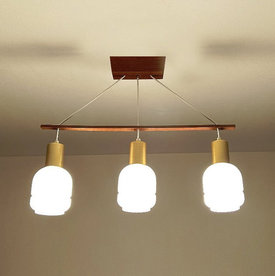 Mid Century Danish modern pendant light featuring a teak wood suspension and 3 opaline glass shades