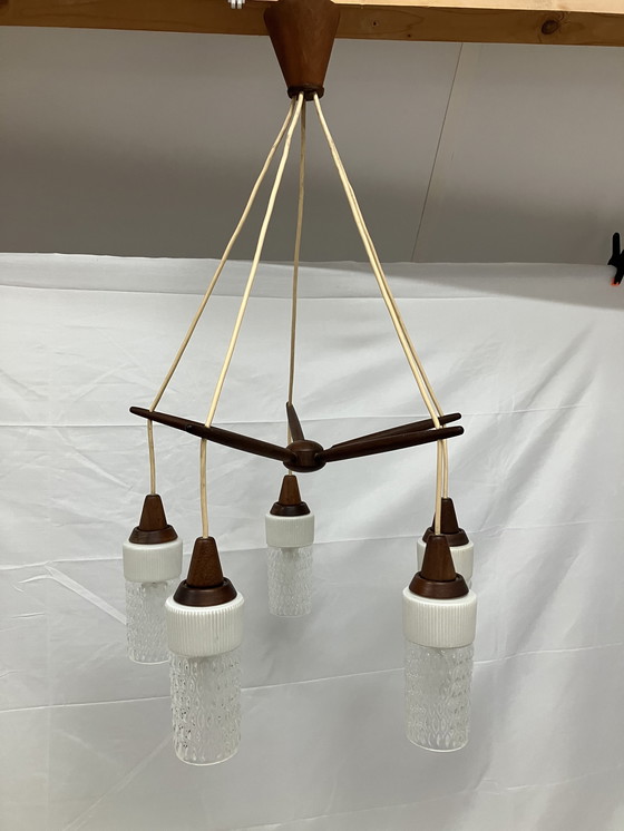 Very nice and completely original vintage Scandinavian pendant lamp consisting of teak wood and glass shades that are partly milk glass.
