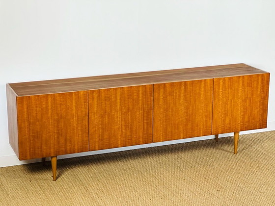 Vintage Scandinavian teak sideboard dating from the 1960s, featuring four storage doors with shelves. Dimensions: H79.5 cm W240 cm D47 cm