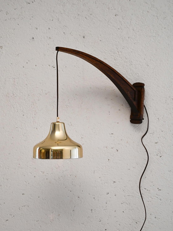 Vintage Scandinavian wall light in walnut, featuring an elegant brass pendant lampshade. The adjustable cord allows easy height customization, while the simple and refined design fits perfectly into retro and modern settings. A unique piece for those who appreciate Scandinavian lighting design from the 1960s.