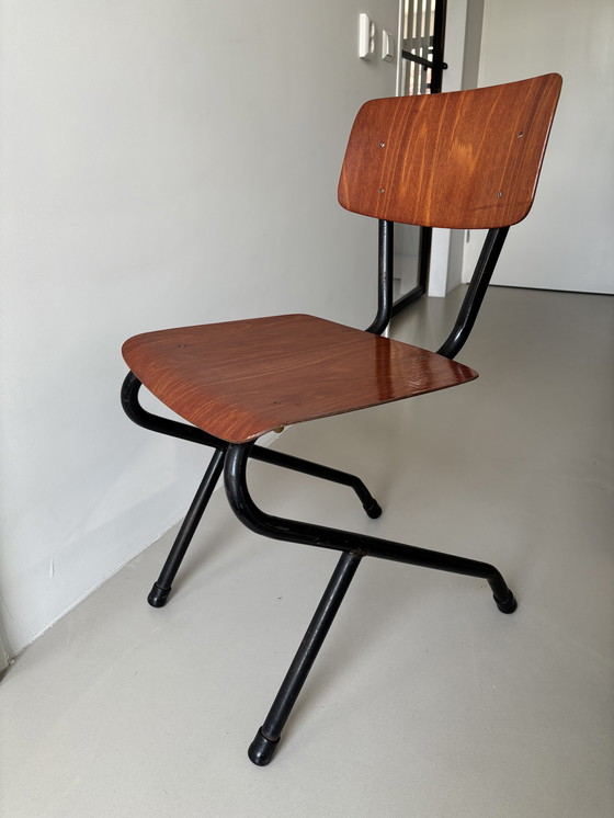 This vintage school chair from the 1970s is a unique model that offers a charming retro look. The chair has a sturdy metal frame with a wooden seat and back, providing a classic and durable construction. Perfect for lovers of retro and vintage furniture, this chair adds character to any room.