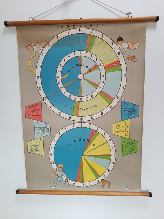 Cool vintage wall chart / school poster about child development +++ Super decorative for a baby's room. Educational gift for new parents :-) +++ 1960s +++ German origin +++ In good condition. There is some slight fraying and very light discoloration in some spots on the edges (barely visible, see photos).