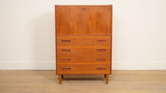 Looking for a stylish workstation or a decorative cabinet? This vintage secretaire made of teak may be what you are looking for! The secretaire was made in Denmark by Westergaards Mobelfabrik. Behind the flap you will find 3 drawers and open storage space. Also, the secretaire has 3 drawers with plenty of storage space. The drawers have nice handles that complete the cabinet!