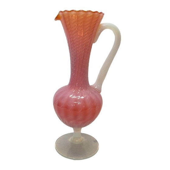 This elegant Selvia Opalina carafe from Italy is a beautiful example of refined glass design from the 1960s. The warm color scheme—an orange core with a soft pink glow on the outside—gives it a unique appearance.