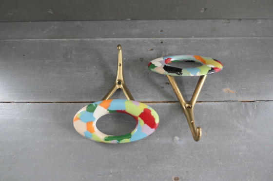 Bring a touch of Italian flair into your home with these vintage 1950s coat hooks. This set of two hooks combines the sheen of copper with a colorful, playful resin design, perfect for brightening up your entryway or bedroom.