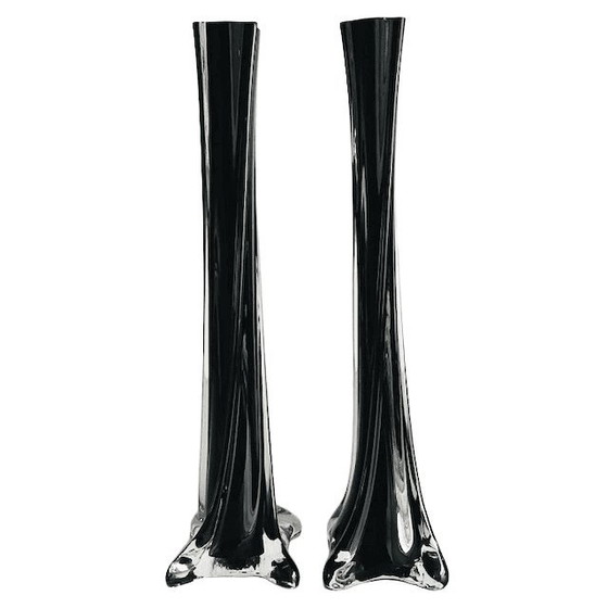 Vintage set of two slimline vases in black, white, and clear glass from the 1970s.