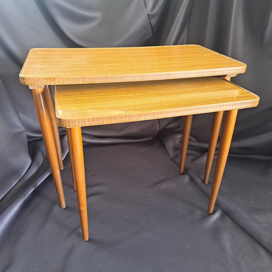 Set of two vintage Mid - Century side tables with a characteristic 1960s design. The tables are finished in wood veneer with a warm wood grain and have gracefully tapered legs. The top table is placed slightly higher, giving a playful and spacious effect.