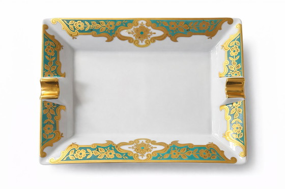 Discover the timeless elegance of this 1970s Sèvres-style cash tray or ashtray. Crafted from fine porcelain, this piece is adorned with a refined 24kt gold floral motif against a turquoise background, adding a touch of luxury to any setting. Perfect as a decorative or functional piece for your living room or office, this tray is an example of high-quality craftsmanship that harks back to the classic Sèvres style. Add a touch of class to your collection with this unique and charming piece.