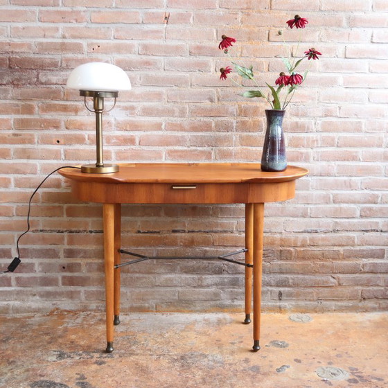 Exceptionally rare side table by A.A. Patijn. The side table is beautifully designed with a raised edge and a drawer with a gold-colored handle. It has an oval shape with brass legs. In good vintage condition, refurbished and treated with hardwax oil.