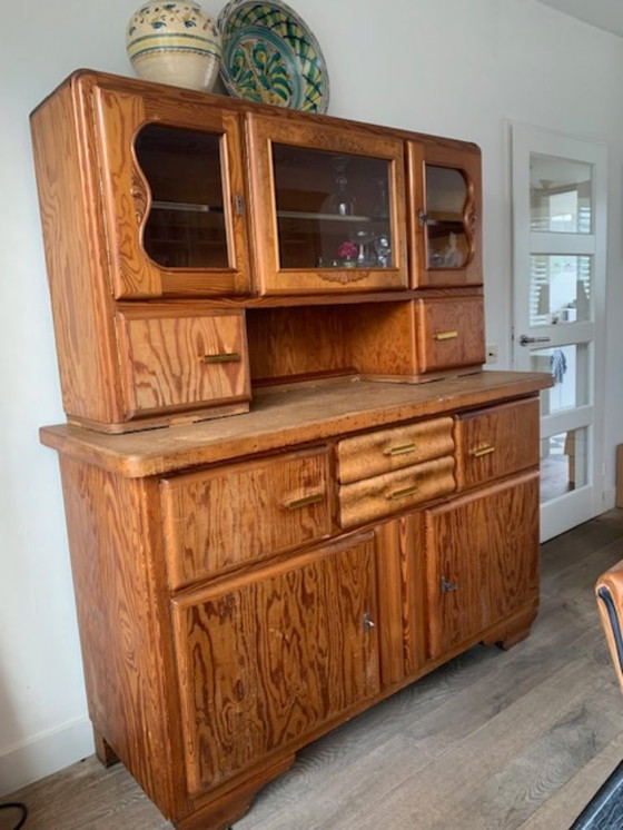 This vintage sideboard is a real eye-catcher in your interior. With its warm wood finish and glass doors, it adds a touch of nostalgia to any space. Perfect for displaying your finest tableware or as a stylish storage solution.