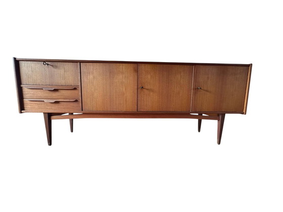 Beautiful sideboard from the 1960s. Body in teak veneer with two drawers, one hinged door, three doors, two shelves and conical feet.