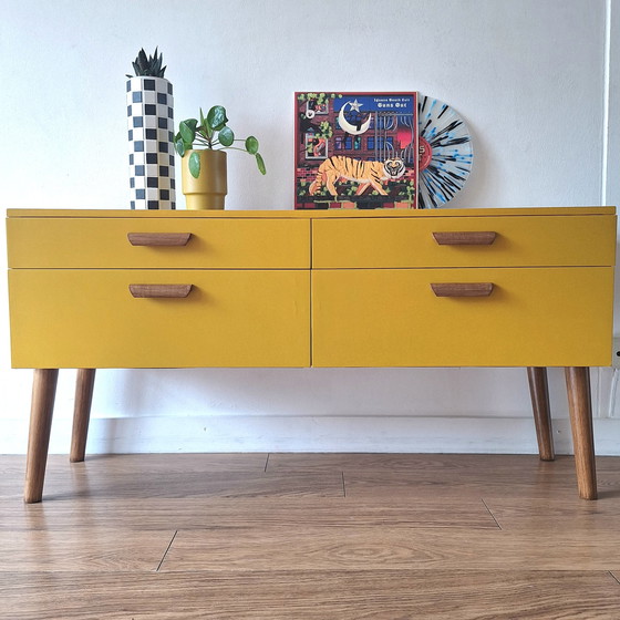 This vintage sideboard adds a touch of retro charm to any room. With its striking yellow color and wooden legs, it is a real eye-catcher.