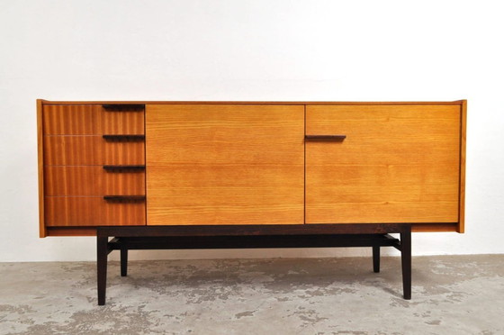 Stylish and sleek design! 1960s. The black wooden base combines beautifully with the warm tone of the wood (ash and mahogany). The sideboard offers ample storage space behind the two doors and in the four drawers.