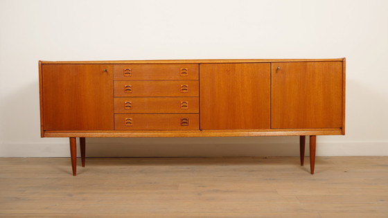 This vintage cabinet immediately stands out for its beautiful design; the drawers have minimalist wooden handles on them. The vintage walnut sideboard has 4 drawers and 3 opening doors. Fantastic vintage sideboard, which fits perfectly into various interior styles! In addition, the vintage cabinet has more than enough storage space.