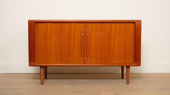 This vintage wall cabinet has an ideal size and is made of teak. This practical, compact sideboard is fitted with 2 tambour sliding doors; the doors slide into the cabinet as it were. This gives the cabinet a very refined and strikingly simple look. Perfect for use as audio furniture for your record player.