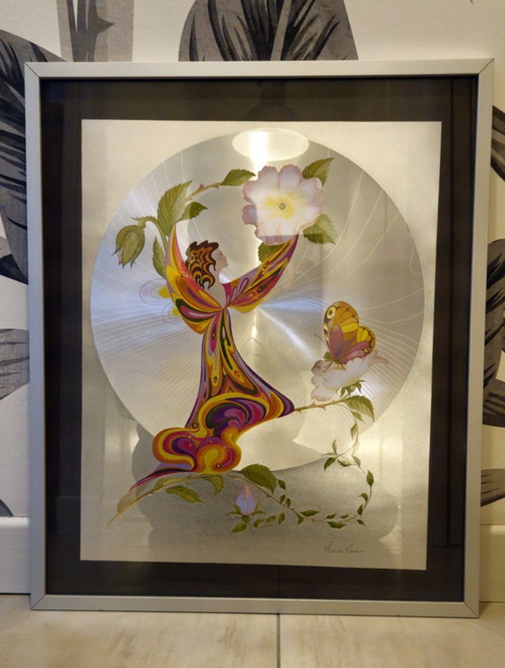 This artwork depicts a stylized nymph with flamboyant wings, surrounded by delicate flowers and a butterfly, against a circular silver optical effect background. A poetic and graphic piece, perfect for vintage, bohemian chic, or boldly seventies decor.