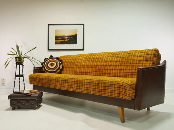 This vintage sofa is an original from the 60s and is made from the original materials. A yellow-brown upholstery fabric has been combined with brown faux leather.