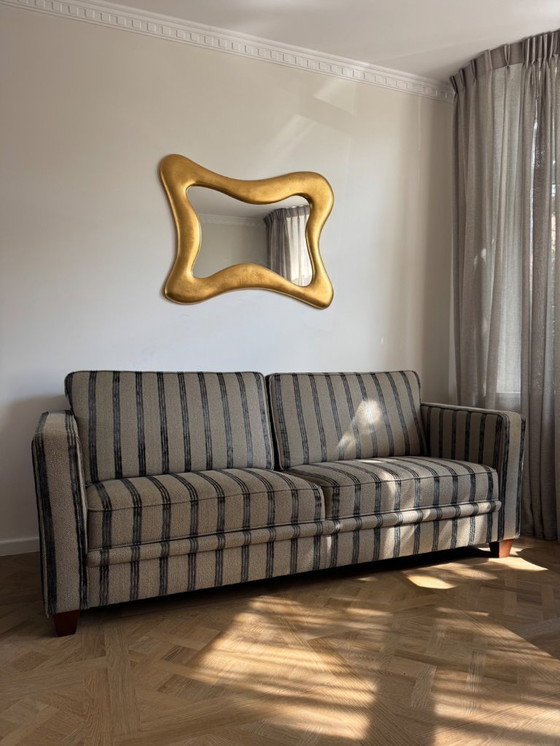 This vintage sofa combines charm with a classic and modern look. The neutral striped fabric adds texture and refinement, while the clean lines and sturdy wooden legs give it a timeless appeal. Comfortable, stylish, and full of character—perfect for enhancing any living space.